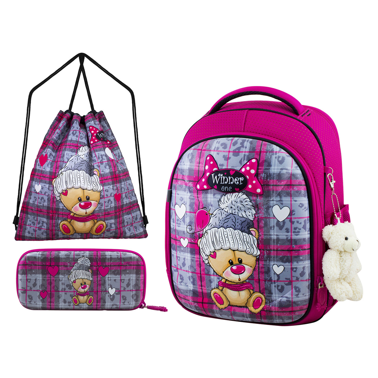 Комплект 3в1: каркасний портфель Winner +мішок +пенал дівчинці для школи на 1-2 клас Шкільний рожевий рюкзак ранець з ведмедиком